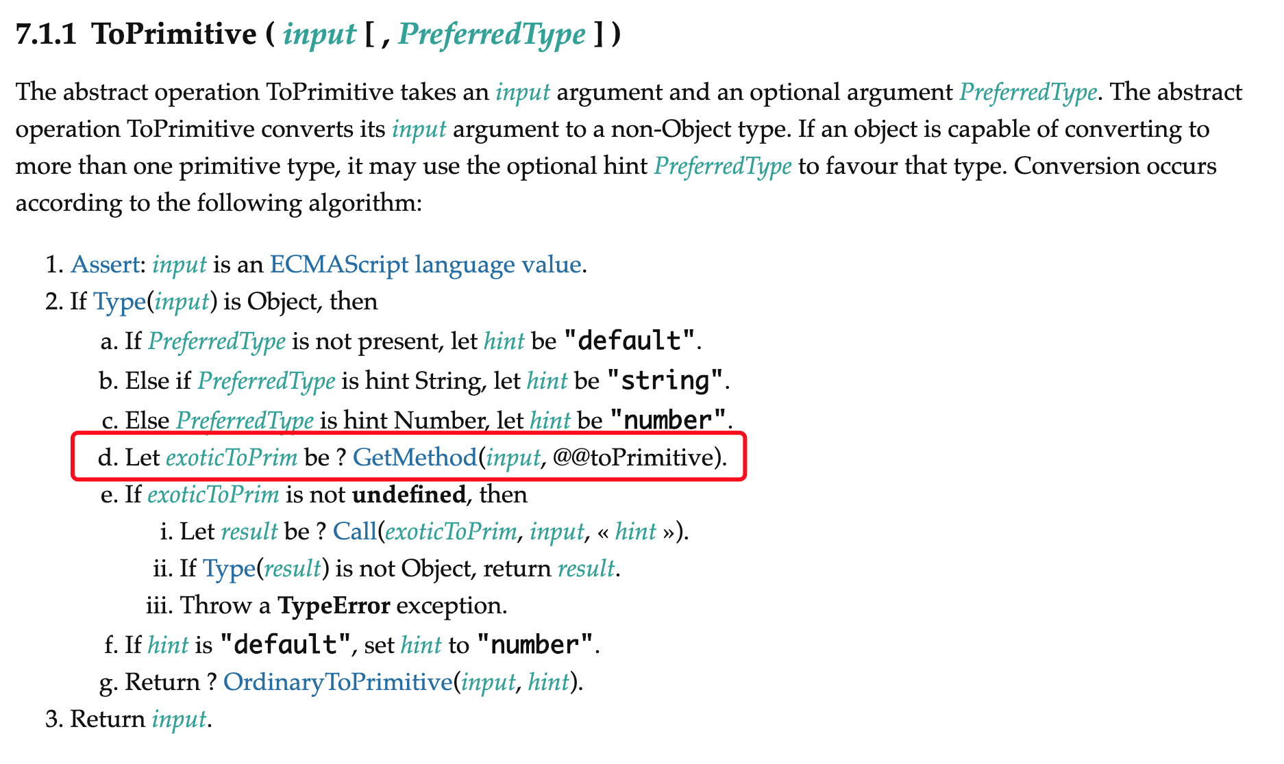 - 这里是对象,所以最后会通过输入参数的toPrimitive方法来获取到一个返回值